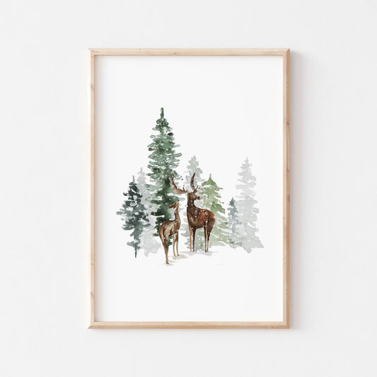 Winter Harmony - Watercolor Deers in Winter Scene - DIGITAL DOWNLOAD