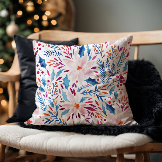 Watercolor Pink Poinsettia and Blue Botanical PILLOW & COVER | WINTER23PL13
