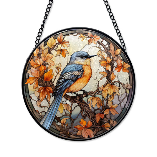 Autumn Bird and Leaves Round Stained Glass Ornament | FALL24RSG15