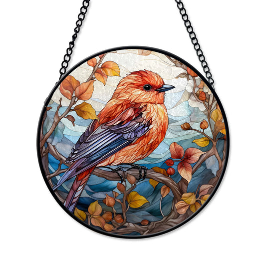 Autumn Bird and Leaves Round Stained Glass Ornament | FALL24RSG16