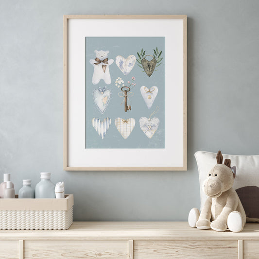 Aquarelle Blue Hearts And Bear Painting Art Print, TÉLÉCHARGEMENT NUMÉRIQUE