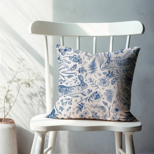 Lapin et fleurs printanières OREILLER ET COUVERTURE BLEU | DÉCOR PRINTEMPS PÂQUES